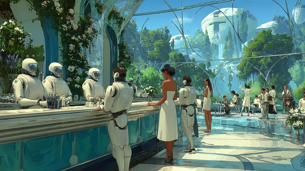 Futuristic AI-powered hotel with robot staff. Created with Midjourney.